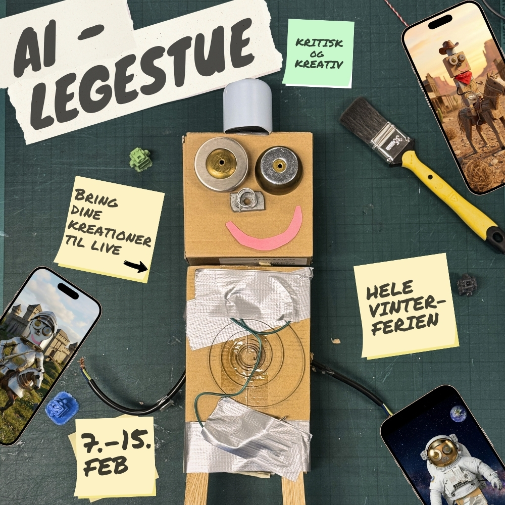Hver dag i vinterferien bygger vi figurer med saks, pap og tape. Sammen udforsker vi, hvordan kreativitet og teknologi kan mødes, når vi med kunstig intelligens vækker dine figurer til live på skærmen.